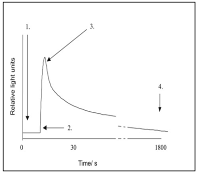 (キー:1.測定開始、2.細菌注入、3.0~5秒間のピーク値記録、試料を混合後、30分後の信号を記録)