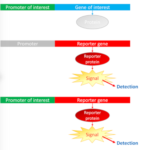 目的遺伝子のプロモーター制御下にレポーター遺伝子を配置することで、さまざまな条件に応答して遺伝子発現がどのように変化するかを容易に追跡することが可能となります。